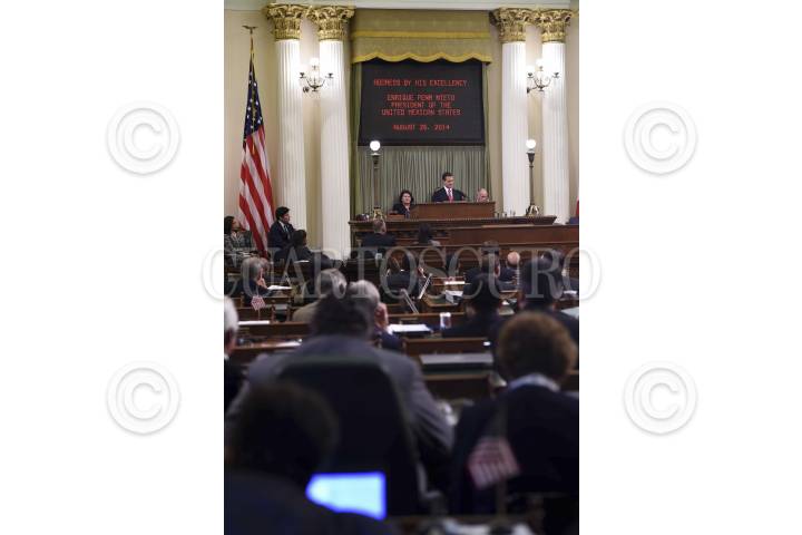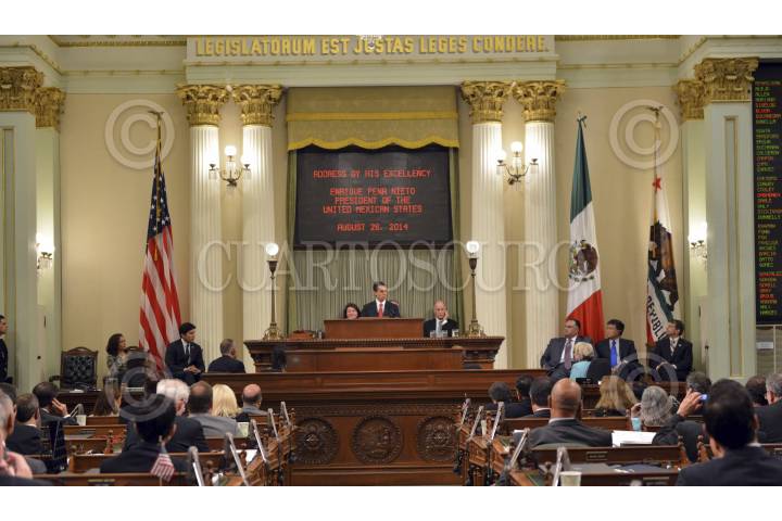 SACRAMENTO, CALIFORNIA, 26AGOSTO2014.- En un acto al que asistió acompañado por el Gobernador Edmund G. Brown, el Presidente Enrique Peña Nieto fue recibido por la Asamblea Estatal de California en una sesión solemne, y en un mensaje que dirigió a los legisladores, les expresó su reconocimiento porque, les dijo, los acuerdos alcanzados en el congreso del estado contribuyen a la prosperidad de los migrantes mexicanos que aquí habitan. FOTO: PRESIDENCIA /CUARTOSCURO.COM