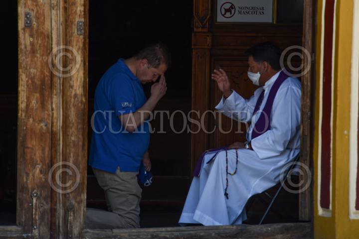 Sacerdote da el sacramento de la confesión en la puerta de la iglesia La Santa Veracruz como medida de prevención ante el COVID-19.