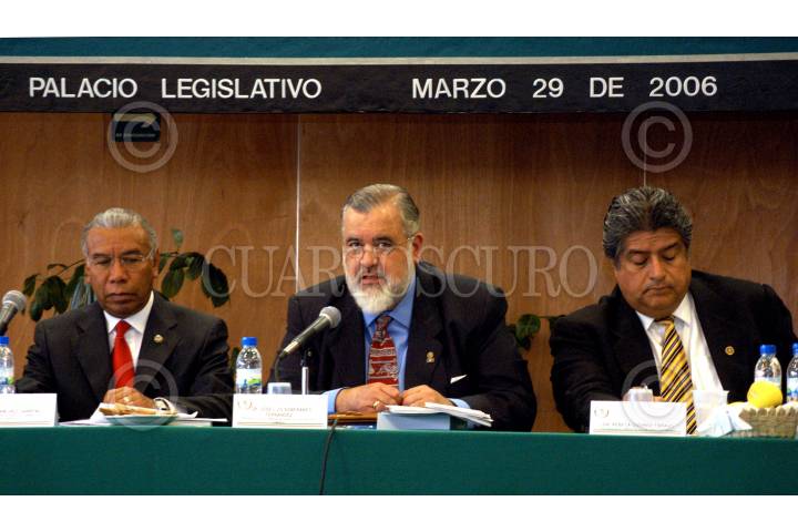 MEXICO D.F. 29 MARZO.2006- El senador, Sadot Sanchez, José Luis Soberanes, presidente de la Comisión de Nacional de Derechos Humanos y el diputado Valdez de Anda, durante la entrga de la Glosa del informe del Obusman, ante la comisión de derechos humanos. FOTO: Guillermo Perea / CUARTOSCURO.COM