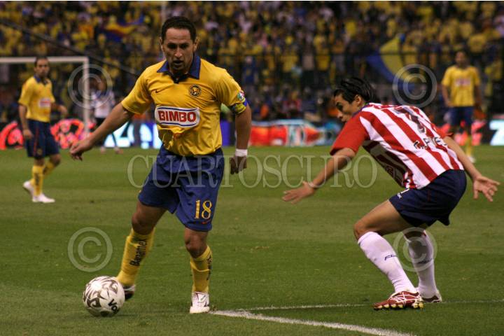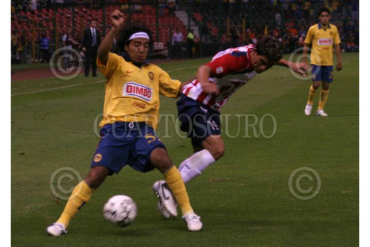 MÉXICO, D.F., 18MARZO2007.- El americanista Juan Mosqueda disputa un balón a José Magallón, en el partido que las Águilas del América se impusieron por 1-0 a las Chivas de Guadalajara. FOTO: ISAAC ESQUIVEL/CUARTOSCURO.COM