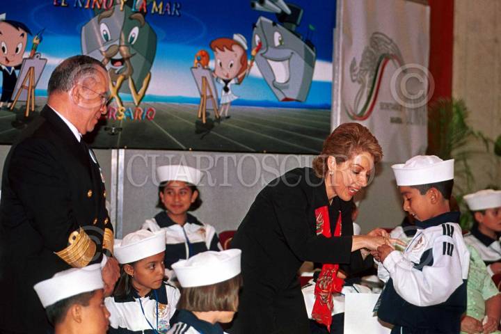 El secretario de marina, Marco Antonio Peyrot en compañia de Martha Sahagun entregarón los premios del concurso infantil "El niño y la Mar" en el salón "Manuel Avila Camacho" de la residencia oficial de Los Pinos. FOTO: Susana Navarrete/CUARTOSCURO.COM