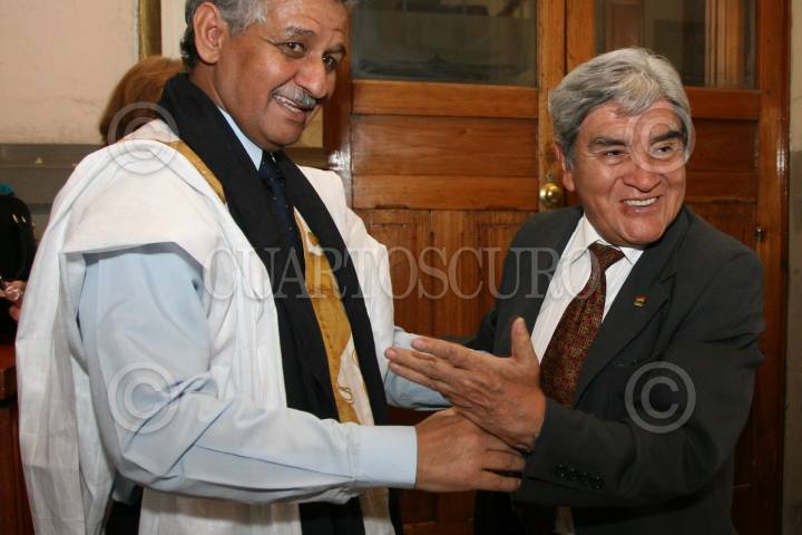 MÉXICO D.F., 03MARZO2010.- Ahmed Mullay, embajador de la República Árabe Saharaui, en nuestro país, encabezo la celebración del 35 aniversario de la independencia de este país, la cual se realizó en el Club de Periodistas. Durante la celebración saludo a Jorge Mancilla Torres, Embajador de Bolivia en México FOTO: GUILLERMO PEREA/CUAROSCURO.COM