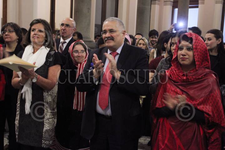 MÉXICO D.F., 03MARZO2010.- Ahmed Mullay, embajador de la República Árabe Saharaui, en nuestro país, encabezo la celebración del 35 aniversario de la independencia de este país, la cual se realizó en el Club de Periodistas. Durante la celebración saludo a Flavio Sosa, integrante de APO y al perredista Saúl Escobar. FOTO: GUILLERMO PEREA/CUAROSCURO.COM
