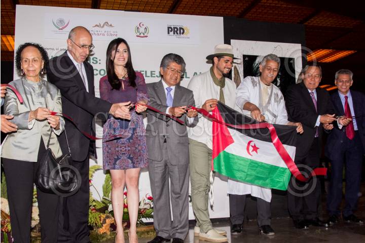 CIUDAD DE MÉXICO, 17ABRIL2017.- María de Lourdes Urbaneja Durant, embajadora de Venezuela en México; Rabah Hadid, embajador de a República Argelina en México; la diputada de Movimiento Ciudadano Verónica Delgadillo; Francisco Martínez Neri, presidente de la Junta de Coordinación Política del PRD en Diputados; el artista mexicano y saharaui Antonio Velázquez Díaz; Ahmed Mulay Ali, embajador de la República Árabe Saharaui Democrática en México, y el diputado perredista Jesús Zambrano, durante la inauguración de la exposición del “Saharauis: Los ojos como reflejo del Alma”, en el Palacio Legislativo de San Lázaro. Las obras buscan expresar los sentimientos que evocan los refugiados en los campamentos de dicha nación tras el conflicto con Marruecos por obtener su independencia. FOTO: GALO CAÑAS /CUARTOSCURO.COM