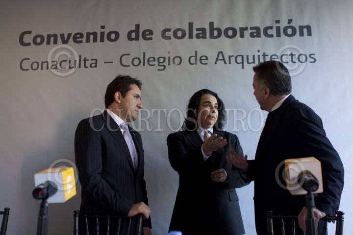 MÉXICO, D.F., 12ENERO2012.- Raúl Arenzana, secretario ejecutivo del Conaculta, Consuelo Sáizar, presidente de Conaculta, y Arturo Aispuro, presidente del Colegio de la Ciudad de México, durante la firma de convenio entre el Consejo Nacional para la Cultura y las Artes y el Colegio de Arquitectos. FOTO: MOISÉS PABLO/CUARTOSCURO.COM