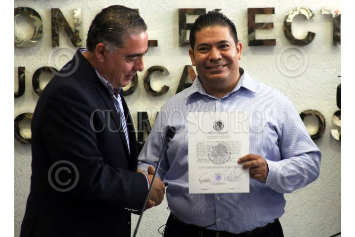 CUERNAVACA, MORELOS, 08JULIO2018.- El consejero presidente de la Junta Local Ejecutiva del Instituto Nacional Electoral, Pablo Sergio Aispuro entrega la constancia de mayoría al senador electo de la coalición Juntos Haremos Historia (MORENA, PT y PSD), Radames Salazar Solorio. FOTO: MARGARITO PÉREZ RETANA /CUARTOSCURO.COM