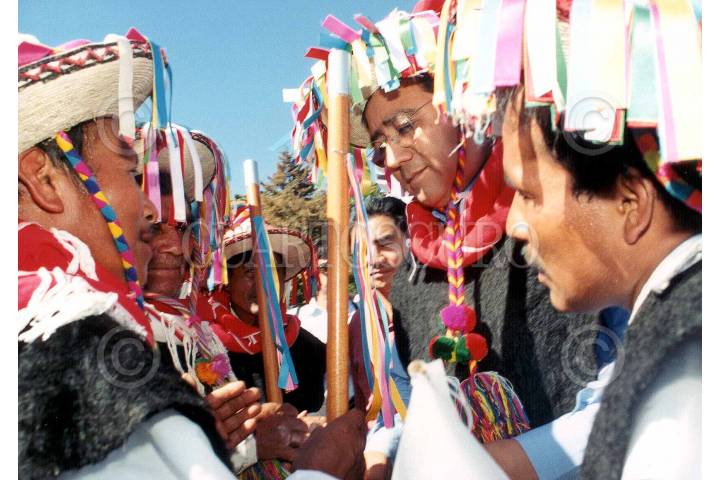El gobernador Pablo Salazar Mendiguchía recibio el baston de mando de las autoridades tradicionales tzotziles en el campamento de Xoyep, Chenalhó. FOTO: Oscar León/CUARTOSCURO.COM