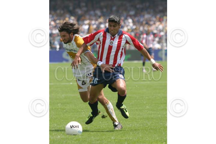 México D.F. 28MARZO2004.- Los Pumas de la UNAM vencieron 3 goles a cero a las Chivas Rayadas de Guadalajara en el encuentro de la jornada 12 del torneo de clausura 2004 en el estadio de C. U. En la gráfica Jose Luis López (pumas) y Carlos Salcido (chivas). FOTO: Iván Stephens/CUARTOSCURO.COM