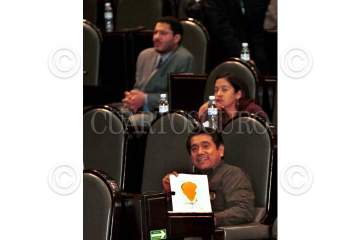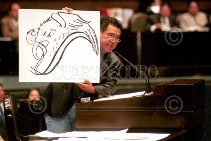 El diputado perredista, Felix Salgado Macedonio, muestra una caricatura de Francisco Gil Díaz, durante su comparecencia ante le pleno de la Cámara de Diputados. FOTO: Oswaldo Ramírez/CUARTOSCURO.COM