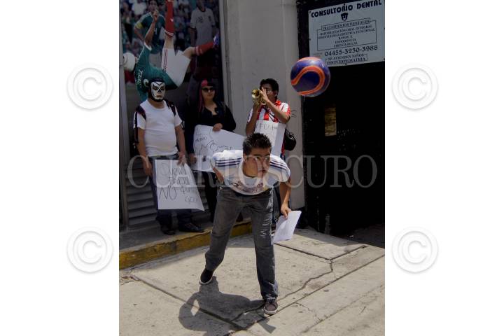 MÉXICO, D.F., 02MAYO2012.- Integrantes del Frente Social por la Igualdad, así como también ciudadanos de la sociedad civil, se manifestaron en las instalaciones de la Federación Mexicana de Futbol, para protestar en contra de Ricardo Salinas Pliego, dueño del equipo de futbol Morelia y propietario de la televisora Azteca, esto debido a la reciente polémica que a surgido en torno a su decisión de transmitir el partido de Morelia, y no el debate electoral. FOTO: PEDRO ANZA /CUARTOSCURTO.COM