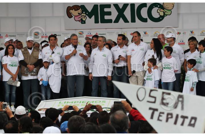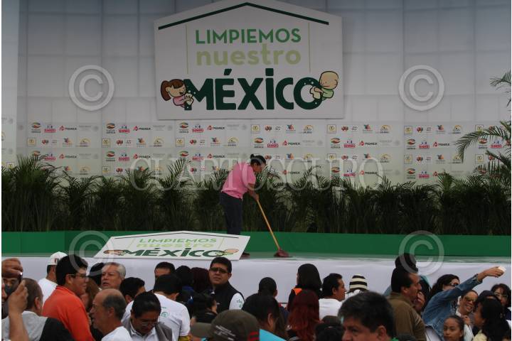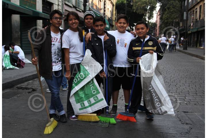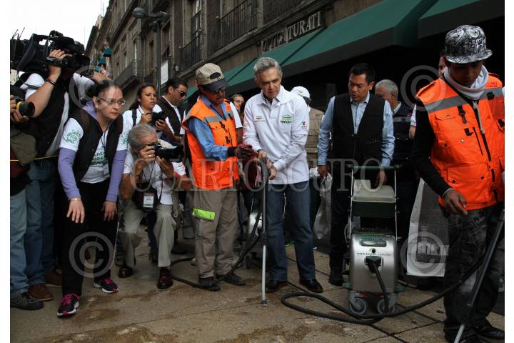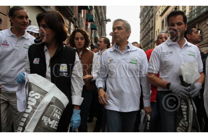 MÉXICO, D.F., 20SEPTIEMBRE2015.- Miguel Ángel Mancera, jefe de gobierno capitalino, acompañado de Ricardo Salinas Pliego, presidente del Grupo Salinas, dieron el banderazo de salida de la jornada de limpieza “Limpiemos México”. Para llevar a cabo la jornada, ciudadanos se organizaron en pequeños grupos para limpiar las calles aledañas al Zócalo. Hace un par de días, durante los Festejos Patrios, la Secretaría de Obras y Servicios detalló que se generó un estimado de 150 toneladas de desechos sólidos en la periferia del Zócalo. FOTO: MARÍA JOSÉ MARTÍNEZ /CUARTOSCURO.COM