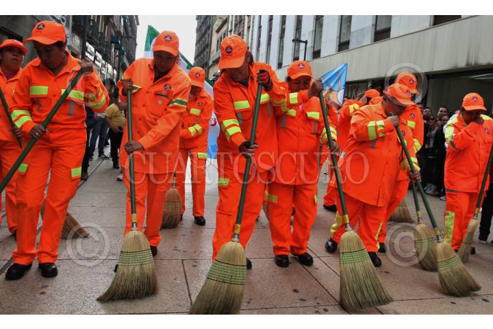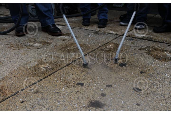MÉXICO, D.F., 20SEPTIEMBRE2015.-Una mujer del personal de limpieza trapea el escenario previo al banderazo de salida de la jornada de limpieza “Limpiemos México”. Para llevar a cabo la jornada, ciudadanos se organizaron en pequeños grupos para limpiar las calles aledañas al Zócalo. Hace un par de días, durante los Festejos Patrios, la Secretaría de Obras y Servicios detalló que se generó un estimado de 150 toneladas de desechos sólidos en la periferia del Zócalo. FOTO: MARÍA JOSÉ MARTÍNEZ /CUARTOSCURO.COM