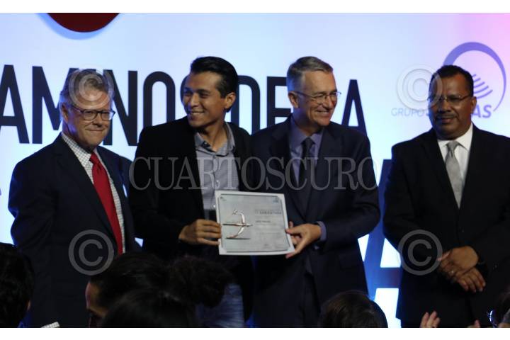 MÉXICO, D.F., 29OCTUBRE2015.- Sergio Sarmiento, conductor y analista, Ron Paul, ex candidato a la presidencia de Estados Unidos, Ricardo Salinas Pliego, empresario dueño de TV Azteca y Rafael E. Micheletti, este último quien fue galordonado con el primer lugar del décimo concurso de Ensayo Caminos de la Libertad, organizada por el Grupo Salinas. FOTO: ADOLFO VLADIMIR /CUARTOSCURO.COM