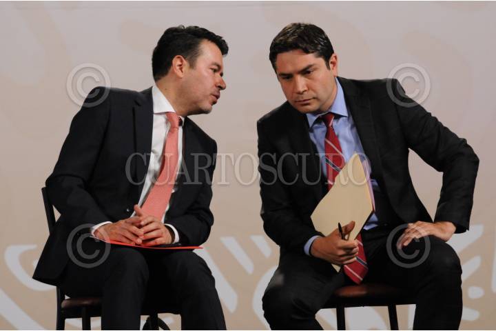 CIUDAD DE MÉXICO, 20MARZO2024.- Félix Arturo Medina, subsecretario de Gobernación y Antonio Martínez Dagnino, titular del SAT, dialogan durante la conferencia mañanera. FOTO: DANIEL AUGUSTO /CUARTOSCURO.COM