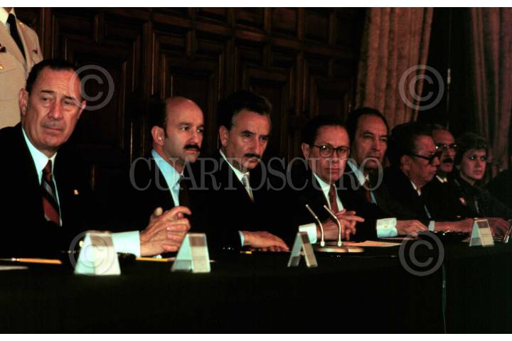 El Presidente Carlos Salinas de Gortari, durante la conformacion del Plan Nacional de Desarrollo 1988-1994, a su lado Fernado Gutierrez Barrios, Fernado Solana. Guillermo Jimenez Morales. 31MAY1989 Foto: Tomas Martinez/Archivo/Cuartoscuro