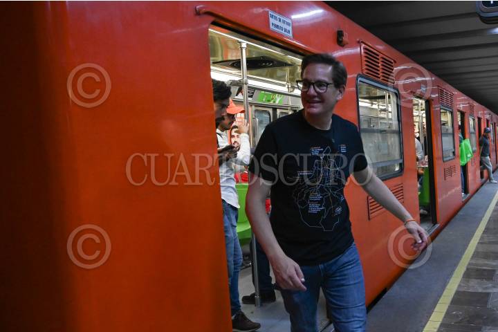 CIUDAD DE MÉXICO, 28MAYO2024.- Salomón Chertorivski, candidato de MC a la jefatura de gobierno, sale de uno de los vagones del metro durante su recorrido por el este transporte público. FOTO: DANIEL AUGUSTO/ CUARTOSCURO.COM