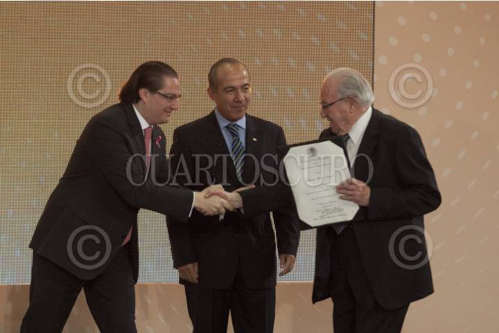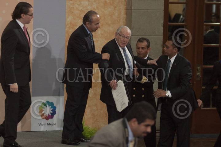 MÉXICO, D.F., 23OCTUBRE2012.- Salomón Chertorivski Woldenberg, secretario de Salud, Felipe Calderón Hinojosa, Presidente de México, y Silvestre Frenk Freund, quien recibió el galardón al mérito médico 2012, en en el marco de la ceremonia conmemorativa del Día del médico. En la imagen el Jefe del Ejecutivo ayuda a el doctor Frenk quien trastabillo al bajar las escaleras del estrado. FOTO: MOISÉS PABLO /CUARTOSCURO.COM