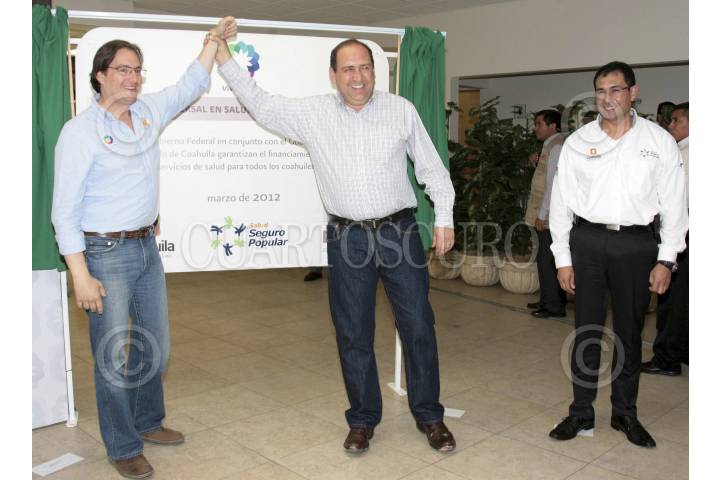 SALTILLO, COAHUILA, 26MARZO2012.- Salomón Chertorivski Woldenberg, secretario de Salud, y Ruben Moreira, gobernador del estado, dieron a a conocer que en Coahuila se alcanzó la cobertura total en servicios de salud, ya que se afiliaron al Seguro Popular a cerca de 700 mil coahuilenses, que se suman a los asegurados en el IMSS e ISSSTE. Los dos funcionarios izaron la bandera blanca y develaron la placa que muestra el logro de la Cobertura Universal en Salud. FOTO: KARLA ITZEL RUIZ /CUARTOSCURO.COM