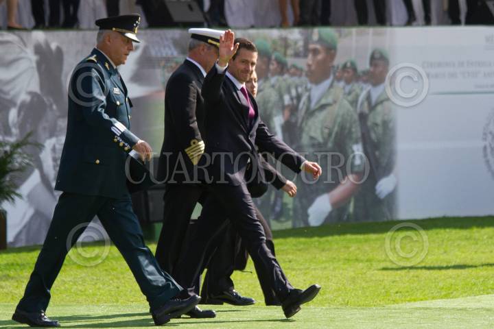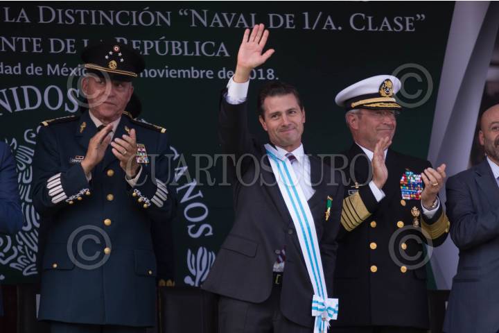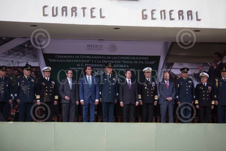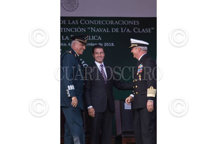 CIUDAD DE MÉXICO, 06NOVIEMBRE2018.- Se realizó la Ceremonia de Otorgamiento de las Condecoraciones Servicios Distinguidos y a la Distinción Naval 1/ clase al Presidente Enrique Peña Nieto, el evento se realizó en la Explanada Damián Carmona en el Campo Militar 1-A, el evento fue encabezado por el General Salvador Cienfuegos Cepeda, secretario de la Defensa Nacional y el Almirante Vidal Francisco Soberón Sanz, secretario de Marina. FOTO: ILSE HUESCA /CUARTOSCURO.COM