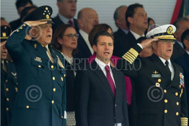 CIUDAD DE MÉXICO, 20NOVIEMBRE2018.- Salvador Cienfuegos, secretario de la Defensa Nacional; Enrique Peña Nieto, Presidente de México, y Vidal Francisco Soberón Sanz, secretario de la Marina Armada de México, durante la ceremonia del 108 aniversario de la Revolución Mexicana, realizado en Campo Marte. Este fue uno de los últimos eventos del mandatario Peña Nieto con militares en su cargo de Jefe Supremo de las Fuerzas Armadas. FOTO: MOISÉS PABLO /CUARTOSCURO.COM