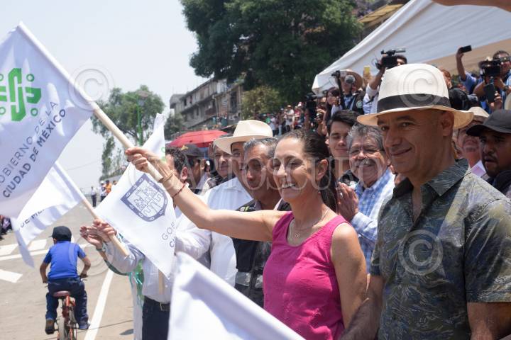 CIUDAD DE MÉXICO, 14ABRIL2019.- Claudia Sheinbaum, jefa de Gobierno y Salvador Guerrero Chitres, Consejero Presidente de Seguridad Pública y Procuración de Justicia, durante el banderazo de la reapertura de la Carretera Xochimilco-Tulyehualco, al cruce con la calle Cocoxochitl, colonia Tejomulco el Bajo, vialidad que fue afectada en el sismo del 19 de septiembre del 2017. FOTO: GRACIELA LÓPEZ /CUARTOSCURO.COM