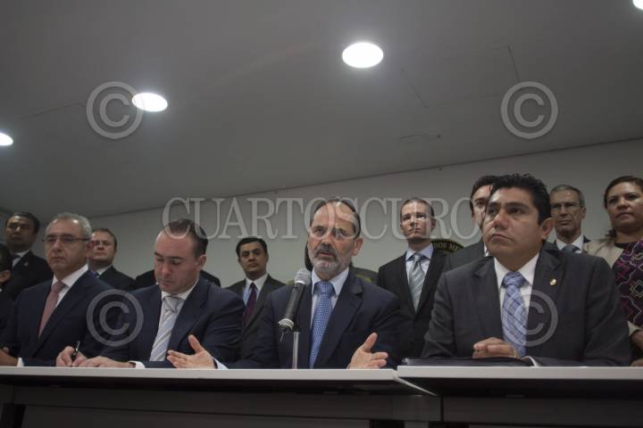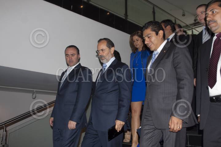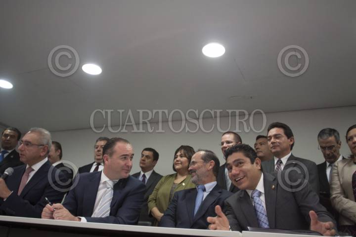 MÉXICO, D.F., 31JULIO2013.- Los panistas Salvador Vega Casillas, Luis Alberto Villareal, coordinador de los diputados, Gustavo Madero, presidente del partido y Jorge Luis Preciado, coordinador de los senadores, durante la presentación de la propuesta del blanquiazul en materia energética, misma que será presentada ante el pleno de la Comisión Permanente de la Cámara Alta. FOTO: MOISÉS PABLO /CUARTOSCURO.COM