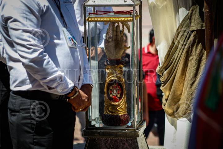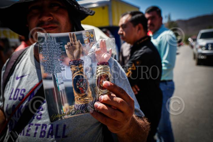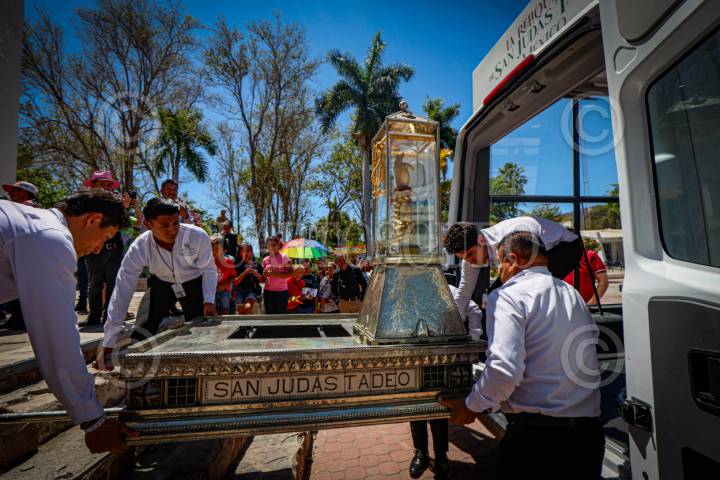 BADIRAGUATO, SINALOA, 28MARZO2025.- Las reliquias de San Judas Tadeo llegaron este viernes a Badiraguato, donde fueron recibidas por decenas de devotos en el arco de bienvenida de la localidad. Posteriormente, fueron llevadas al Parque Mirador, hogar de una imponente escultura de 27 metros en honor al santo, y más tarde, a la Parroquia de San Juan Bautista, donde se celebró una misa. Según el padre José Ricardo Castillo Mendoza, la reliquia, de primer grado, corresponde a un fragmento de hueso del brazo de San Judas Tadeo, resguardado en un relicario en forma de brazo. Pese al intenso calor, los peregrinos recorrieron 1.8 kilómetros a pie acompañados por música de banda. Las reliquias pasarán las noches en Badiraguato y continuarán su peregrinación por México a partir de este sábado. FOTO: JOS´E BETANZOS ZÁRATE/CUARTOSCURO.COM