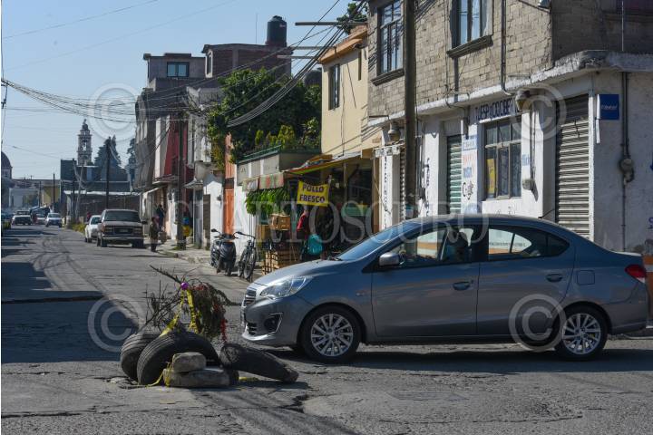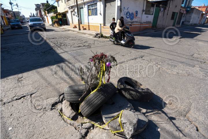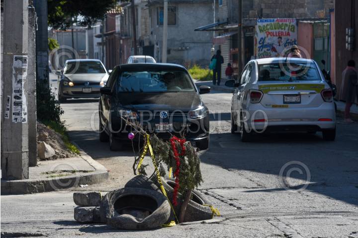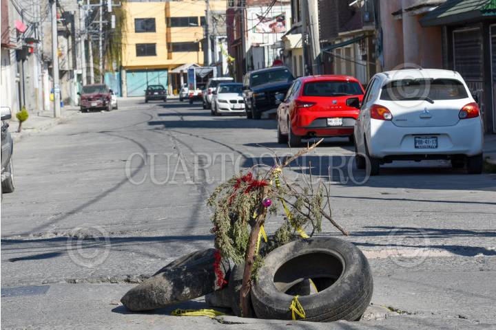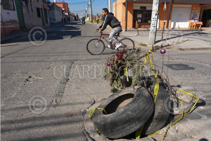 Vecinos de San Lorenzo Tepaltitlán adornaron las coladeras con una rama, esferas y escarcha por los próximos festejos navideños ante el mal estado de las tapas así como el robó de las mismas.