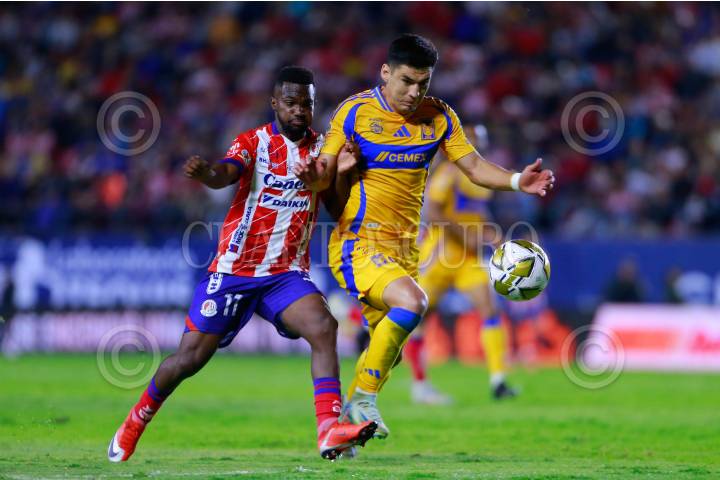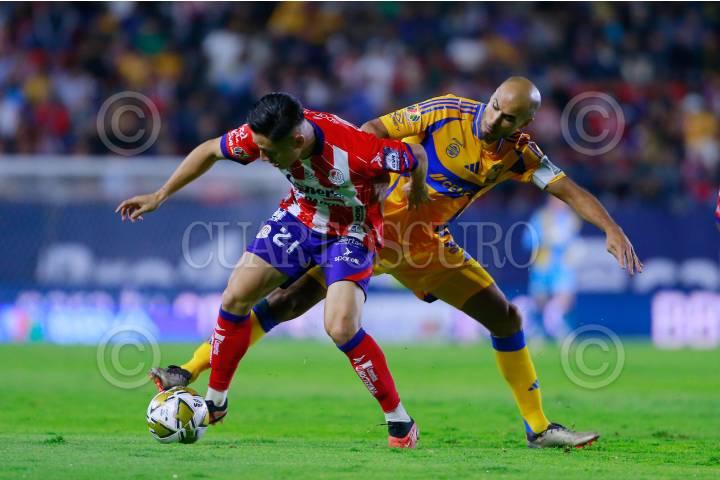SAN LUIS POTOSÍ, SAN LUIS POTOSÍ, 28NOVIEMBRE2024.- Vitor Ferreira Vitinho de Atlético San Luis y Jesús Angulo del Tigres de la UANL, durante el partido de ida de los cuartos de final del Torneo Apertura 2024 de la Liga BBVA MX en el Estadio Alfonso Lastras. Los locales se impusieron 3-0. FOTO: CÉSAR GÓMEZ/CUARTOSCURO.COM