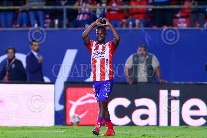 SAN LUIS POTOSÍ, SAN LUIS POTOSÍ, 28NOVIEMBRE2024.- Vitor Ferreira Vitinho del Atlético San Luis festeja su gol durante el partido ante los Tigres de la UANL, correspondiente al juego de ida de los cuartos de final del Torneo Apertura 2024 de la Liga BBVA MX en el Estadio Alfonso Lastras. FOTO: CÉSAR GÓMEZ/CUARTOSCURO.COM