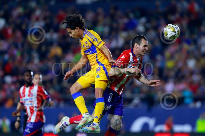 SAN LUIS POTOSÍ, SAN LUIS POTOSÍ, 28NOVIEMBRE2024.- Diego Lainez de los Tigres de la UANL y Leonardo Bonatini del Atlético San Luis disputan el balon durante el partido de ida de los cuartos de final del Torneo Apertura 2024 de la Liga BBVA MX en el Estadio Alfonso Lastras. FOTO: CÉSAR GÓMEZ/CUARTOSCURO.COM