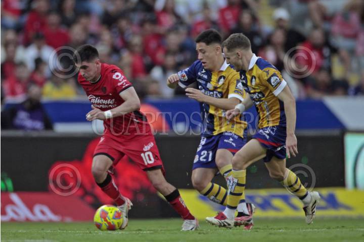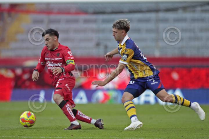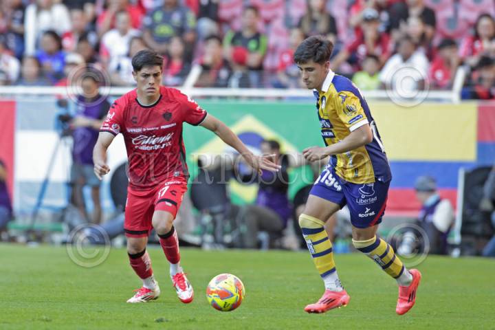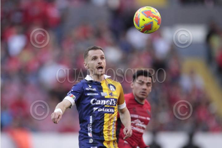 GUADALAJARA, JALISCO, 02MARZO2025.- Aldo Rocha, jugador de Atlas, disputa el balón con el contrario de San Luis, Mateo Climowiccs, esto en partido correspondiente a la jornada 10 del Torneo Clausura 2025 de la Liga MX, en donde se enfrentan los equipos de Atlas vs San Luis y en juego que se lleva a cabo en el Estadio Jalisco, el marcador al momento es de 1-1. FOTO: FERNANDO CARRANZA GARCIA / CUARTOSCURO.COM