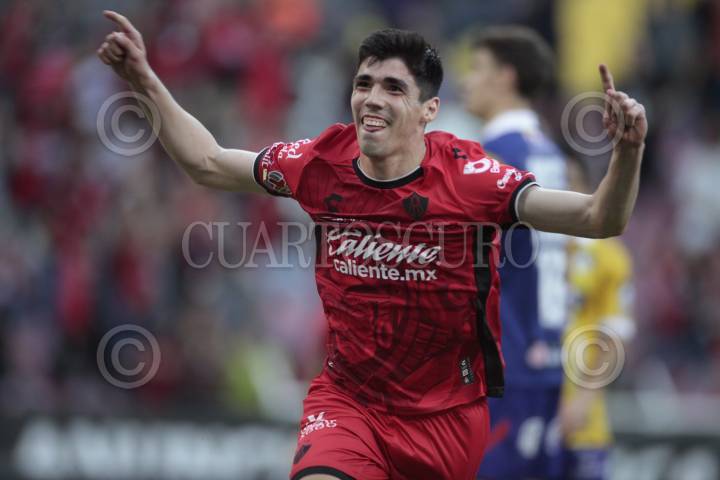GUADALAJARA, JALISCO, 18FEBRERO2025.- Oscar Macías jugador de San Luis, celebra su anotación, esto en partido correspondiente a la jornada 10 del Torneo Clausura 2025 de la Liga MX, en donde se enfrentan los equipos de Atlas vs San Luis y en juego que se lleva a cabo en el Estadio Jalisco, el marcador al momento es de 1-1. FOTO: FERNANDO CARRANZA GARCIA / CUARTOSCURO.COM