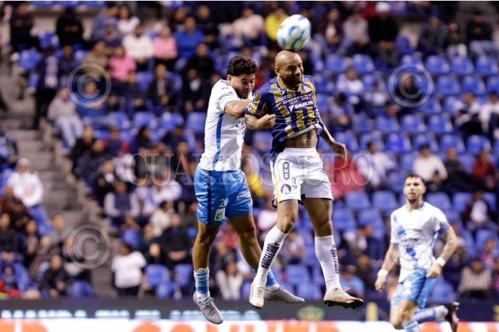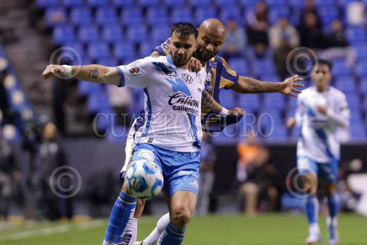 PUEBLA, PUEBLA, 15AGOSTO2025.- José Pachuca y Joao Geraldino durante el partido entre entre el Club Puebla y Atlético San Luis, correspondiente a la jornada 5 del torneo Apertura 2025 de la Liga BBVA MX, celebrado en el Estadio Cuauhtémoc. FOTO: MIREYA NOVO/ CUARTOSCURO.COM