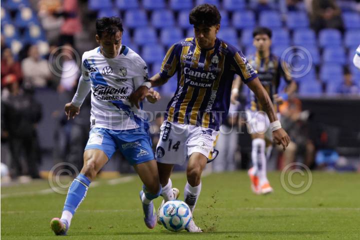 PUEBLA, PUEBLA, 15AGOSTO2025.- Oscar Macías y Juan Manuel Sanabria durante el partido entre entre el Club Puebla y Atlético San Luis, correspondiente a la jornada 5 del torneo Apertura 2025 de la Liga BBVA MX, celebrado en el Estadio Cuauhtémoc. FOTO: MIREYA NOVO/ CUARTOSCURO.COM