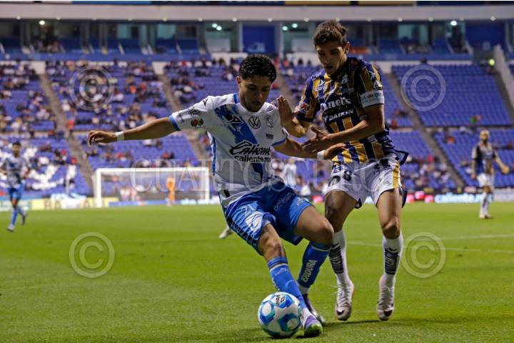 PUEBLA, PUEBLA, 15AGOSTO2025.- Fernando Monárrez y Miguel García durante el partido entre entre el Club Puebla y Atlético San Luis, correspondiente a la jornada 5 del torneo Apertura 2025 de la Liga BBVA MX, celebrado en el Estadio Cuauhtémoc. FOTO: MIREYA NOVO/ CUARTOSCURO.COM