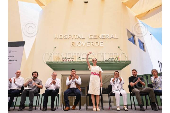 RIOVERDE, SAN LUIS POTOSÍ, 05JULIO2025.- Claudia Sheinbaum, presidenta de México, durante su el acto protocolario de la inauguración de la Torre del Hospital General IMSS-Bienestar en la entidad. La acompañan: David Kershenobich, secretario de Salud; Ricardo Gallardo, gobernador de San Luis Potosí; y Rosa Icela Rodríguez, secretaria de Gobernación. FOTO: PRESIDENCIA/CUARTOSCURO.COM