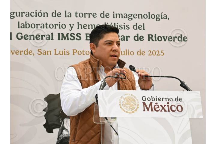 RIOVERDE, SAN LUIS POTOSÍ, 05JULIO2025.- Ricardo Gallardo, gobernador de San Luis Potosí; durante su participación en el acto protocolario de la inauguración de la Torre del Hospital General IMSS-Bienestar en la entidad. FOTO: PRESIDENCIA/CUARTOSCURO.COM
