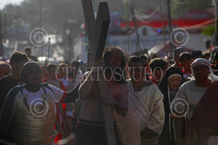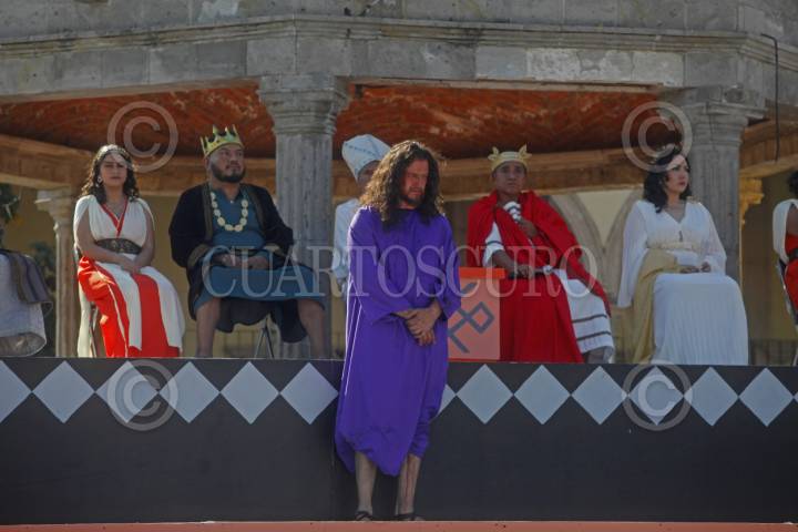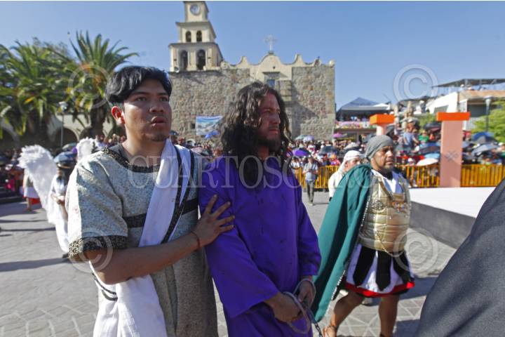 Actores que representan la pasión de Cristo, recorren el poblado de San Martín de las Flores recreando los hechos ocurridos el jueves santo que crucificaron a Jesucristo.