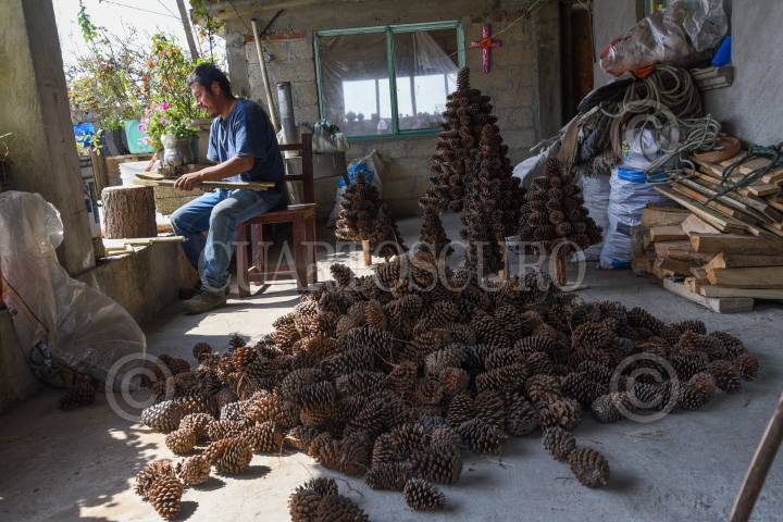 La Familia Pérez tiene más de 13 años dándole otro uso a las pilas de pino, su ingenio los llevó a crear árboles navideños y coronas para los festejos decembrinos, ubicados en San Miguel Mimiapan en el municipio de Xonacatlán.