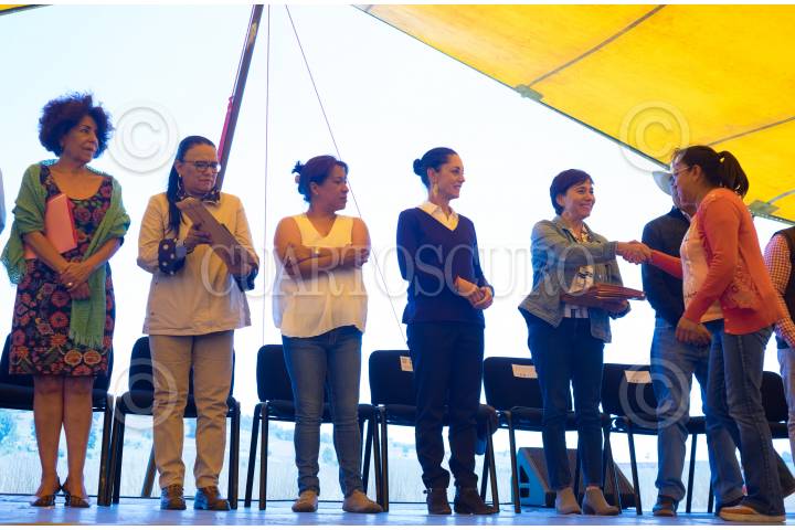 CIUDAD DE MÉXICO, 09JUNIO2019.- Claudia Sheinbaum, jefa de Gobierno; Columba Jazmín López, secretaria de Medio Ambiente y Desarrollo Sustentable y Patricia Aceves Pastrana, alcaldesa de Tlalpan, posaron para una foto junto con locatarios de San Miguel Topilejo, al finalizar la la entrega de apoyos del programa "Altépetl" en el Parque Ecológico las Maravillas. FOTO: GRACIELA LÓPEZ /CUARTOSCURO.COM