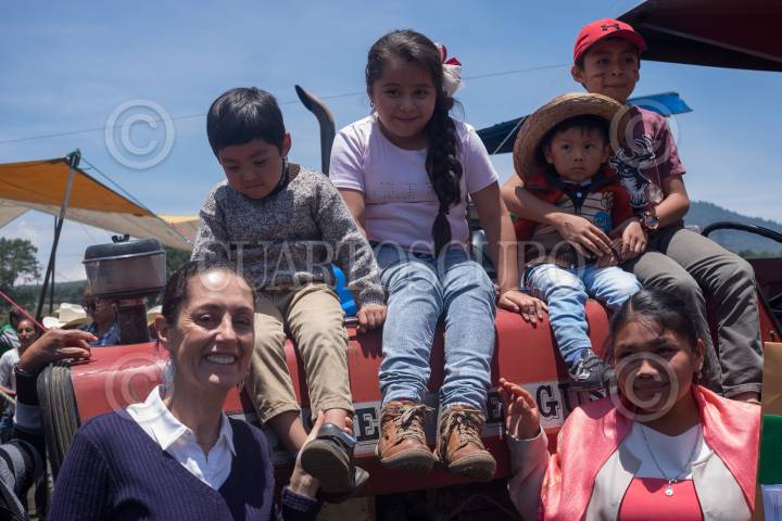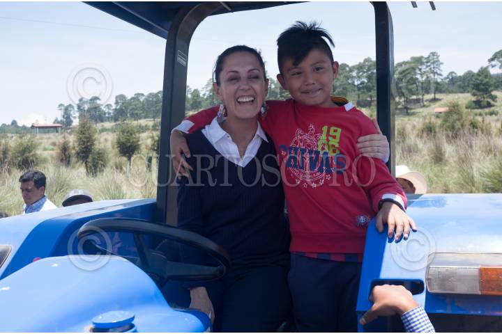 CIUDAD DE MÉXICO, 09JUNIO2019.- Claudia Sheinbaum, jefa de Gobierno y un niño se subieron a tractor al finalizar la entrega de apoyos del programa "Altépetl", en el parque Ecológico las Maravillas, San Miguel Topilejo, alcaldía Tlalpan. FOTO: GRACIELA LÓPEZ /CUARTOSCURO.COM