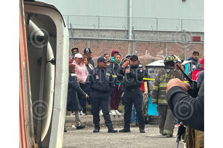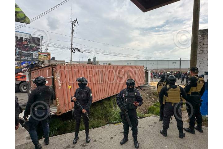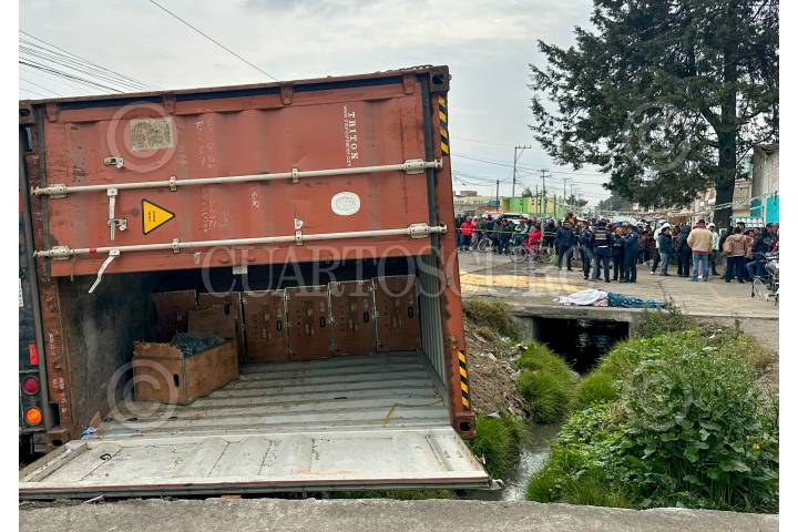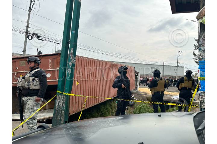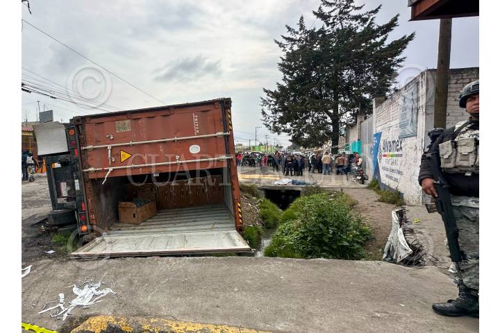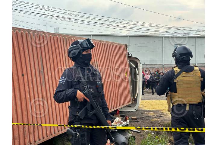 TOLUCA, ESTADO DE MÉXICO, 19FEBRERO2025.- Al menos una persona perdió la vida la registrarse la volcadura de un tráiler en Boulevard Aeropuerto y su cruce con la calle Juan Fernández Albarrán en la colonia de San Nicolás Tolentino, cuerpos de emergencia acudieron al lugar al ser reportado el accidente en el que se vieron involucrados dos estudiantes que viajaban en un mototaxi, quedando atrapados bajo la caja de carga, en donde lograron sacar a uno de ellos con vida y el otro murió en el lugar. FOTO: CRISANTA ESPINOSA AGUILAR /CUARTOSCURO.COM