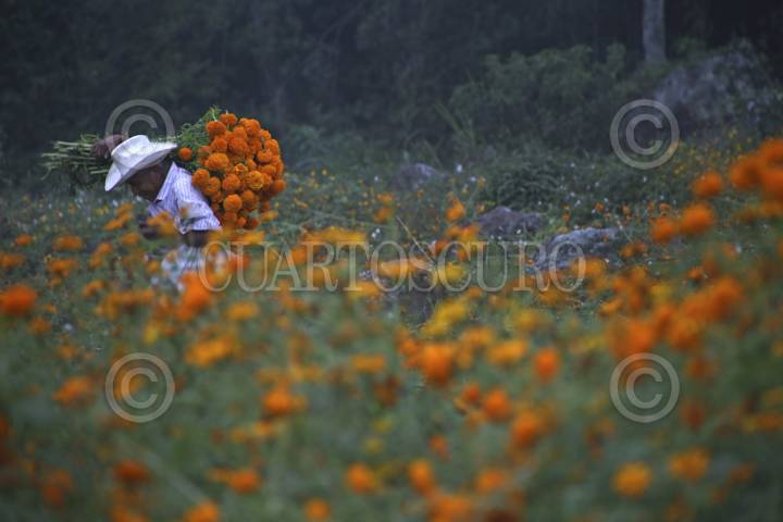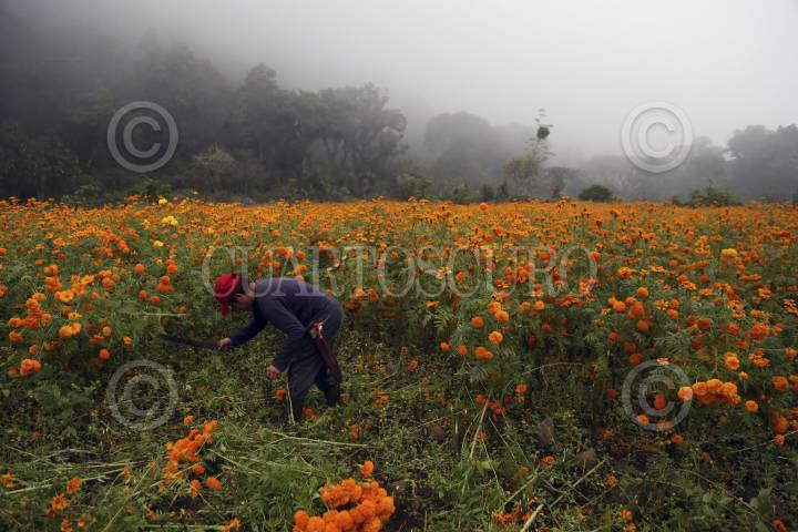 SAN PABLO COAPAN, VERACRUZ, 27OCTUBRE2016.- Jornaleros de San Pablo Coapan trabajan cortando la característica flor de cempasúcil para los festejos del Día de Muertos, con un sueldo de $500 por campo llevan sustento a sus familias en jornadas de hasta 15 horas diarias. FOTO: ALBERTO ROA /CUARTOSCURO.COM