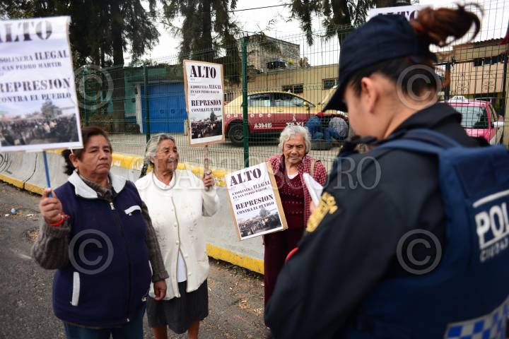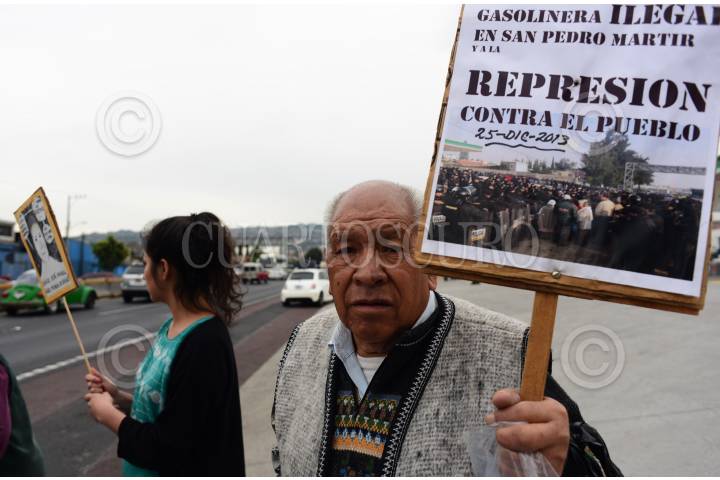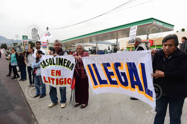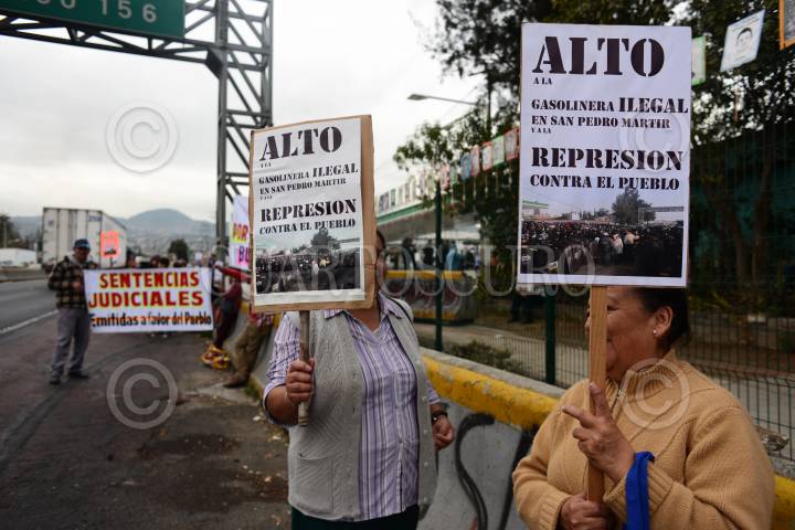 MÉXICO, D.F., 23DICIEMBRE2014.- Un grupo de aproximadamente 40 personas se manifiestaron en contra de una gasolinera ubicada en el kilómetro 19 de la autopista México -Cuernavaca, en el pueblo de San Pedro Mártir de la delegación Tlalpan. Los pobladores mencionan que se oponen a esta, ya que ha bloqueado la única calle que tenían para comunicarse al centro de San Pedro Mártir, a raíz de esta construcción se han presentado muchos accidentes automovilísticos que ponen en riesgo a los peatones y sufren de escasez de agua, provocado por el descuido de las tuberías en la construcción de la gasolinera. El día 25 de diciembre del año pasado se manifestaron en contra de corpogas (dueño de dicha gasolinera), llegaron 2480 granaderos, y con uso de violencia desalojaron a los manifestantes, así también algunos de los elementos de la policía actuaron como "franeleros", señalando a los automovilistas la entrada a la gasolinera. FOTO: ISABEL MATEOS /CUARTOSCURO.COM