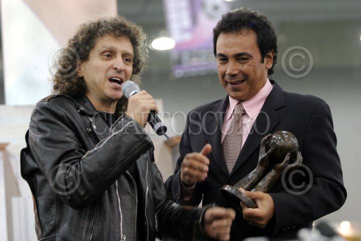 MEXICO, DF 20JULIO2005.- Durante el primer día de la Futbol Expo-Show le fué entregado un reconocimiento por su trayectoria a Hugo Sanchéz; el premio le fue entregado por el rockero Alex Lora. FOTO: Miguel Dimayuga/CUARTOSCURO.COM