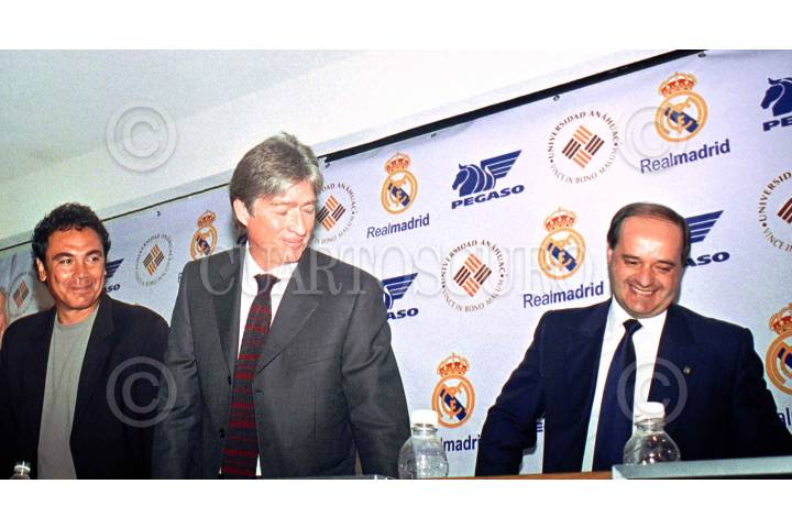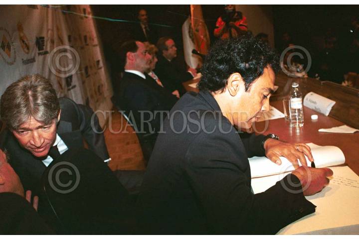 Mientras que Hugo Sanchez, entrenador de las Pumas, firma un autografo, Alejandro Burillo Azcárraga, conversa durante la firma contrato para la sede de la Escuela de Futbol Real de Madrid en México. FOTO:Eunice Adorno/CUARTOSCURO.COM