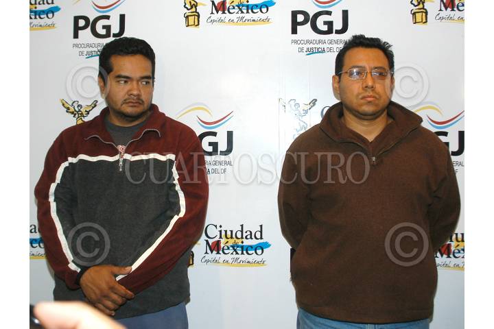 MÉXICO, D.F., 22MARZO2009.-La Procuraduría del Distrito Federal presento a Rodolfo Gerardo San German Cruz responsable de la muerte de su esposa Gabriela Galindo, quien apareció muerta en un auto Clio de color gris en calles de la Delegación Gustavo A. Madero el jueves pasado.. Al descubrirla que lo engañaba con su padrino de anillos y amante de la hoy occisa. Alejandro Oviedo Navarro, quien también fue detenido por falsedad de declaraciones. FOTO: LUIS CARBAYO/ CUARTOSCURO.COM