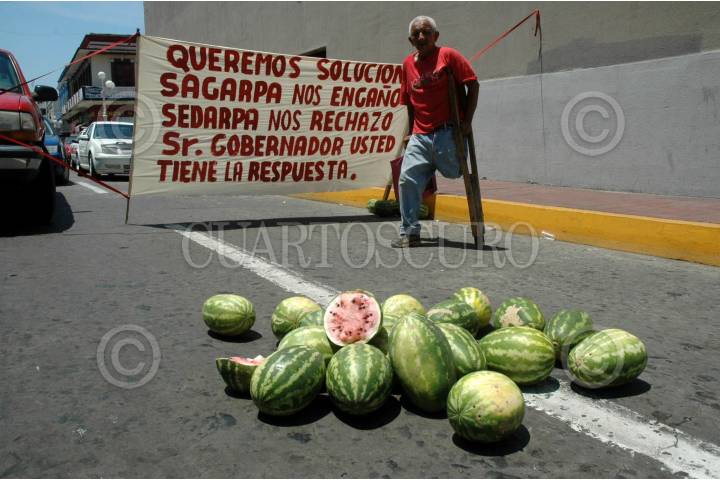 VERACRUZ, VER. 06MAYO2008.- Productores de sandia del municipio de Alvarado bloquearon por espacio de cinco horas la avenida cinco de mayo en el centro de la ciudad, donde se encuentran las oficinas de la SAGARPA, lugar donde pedían ser atendidos. Ya que nunca llegaron los apoyos prometidos por lo se han perdido trescientas hectáreas de este fruto. FOTO: JOSE CANDELARIO/CUARTOSCURO.COM