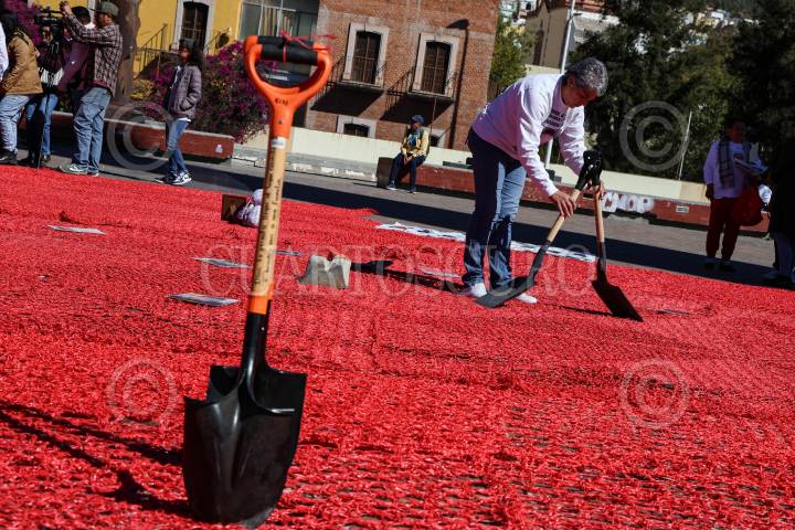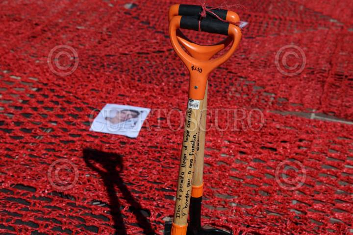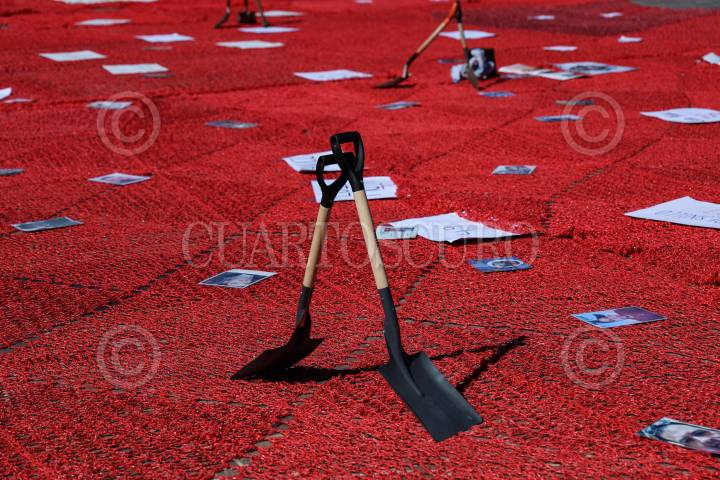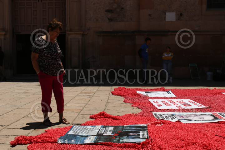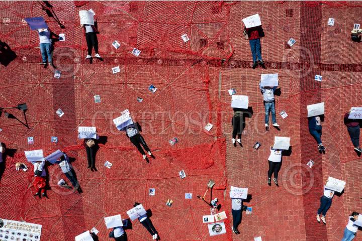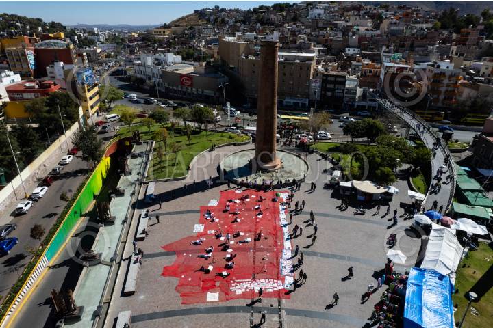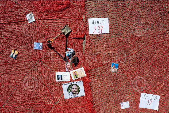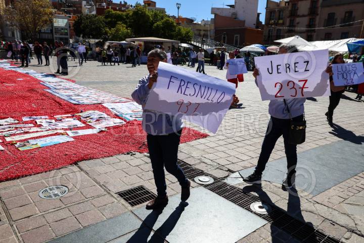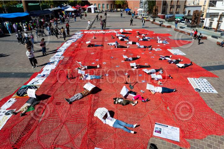 ZACATECAS, ZACATECAS, 27DICIEMBRE2024.- Colectivos de madres buscadoras y solidarios de la colectiva “Sangre de mi Sangre”, realizaron una intervención del espacio público como memoria a las personas desaparecidas en Zacatecas. Sobre la plancha de la Plaza Bicentenario en pleno centro de la capital las madres y familiares se recostaron sobre el tejido con cartulinas que indicaban la cantidad de desaparecidos por municipio, acompañadas de picos, palas, ositos y fotos como símbolo de memoria y búsqueda. FOTO: ADOLFO VLADIMIR /CUARTOSCURO.COM